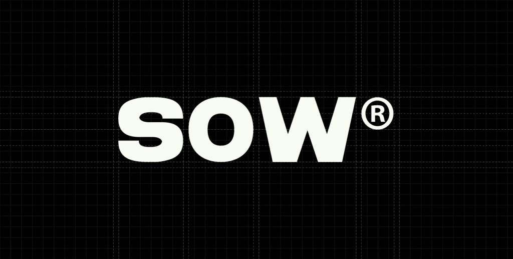 The construction of Sow’s logo prioritized a clean, robust and timeless font, reinforcing its strong personality. We chose the “Akimbo” typeface in “Black” weight to write the brand name, making fine adjustments to create a symmetrical composition and personalize the font. The final logo features the name “SOW” in all caps, accompanied by the ® symbol (which indicates a trademark registered with the appropriate agency, in this case, the INPI in Brazil).