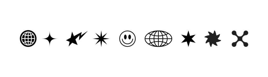 The supporting graphics elements of Sow’s visual identity were created to add value to the project, expanding brand applications beyond the simplicity of the logo. They combine influences from brutalism Brutalism is manifested through the use of rigid and structured geometric shapes, conveying solidity and functionality. and Y2KThe Y2K influence appears in futuristic and holographic symbols that refer to digital and technological elements from 00`s. aesthetics, resulting in a striking and contemporary visual composition.