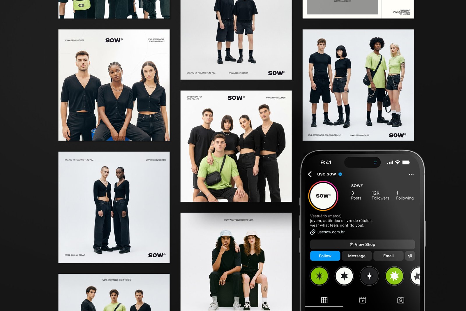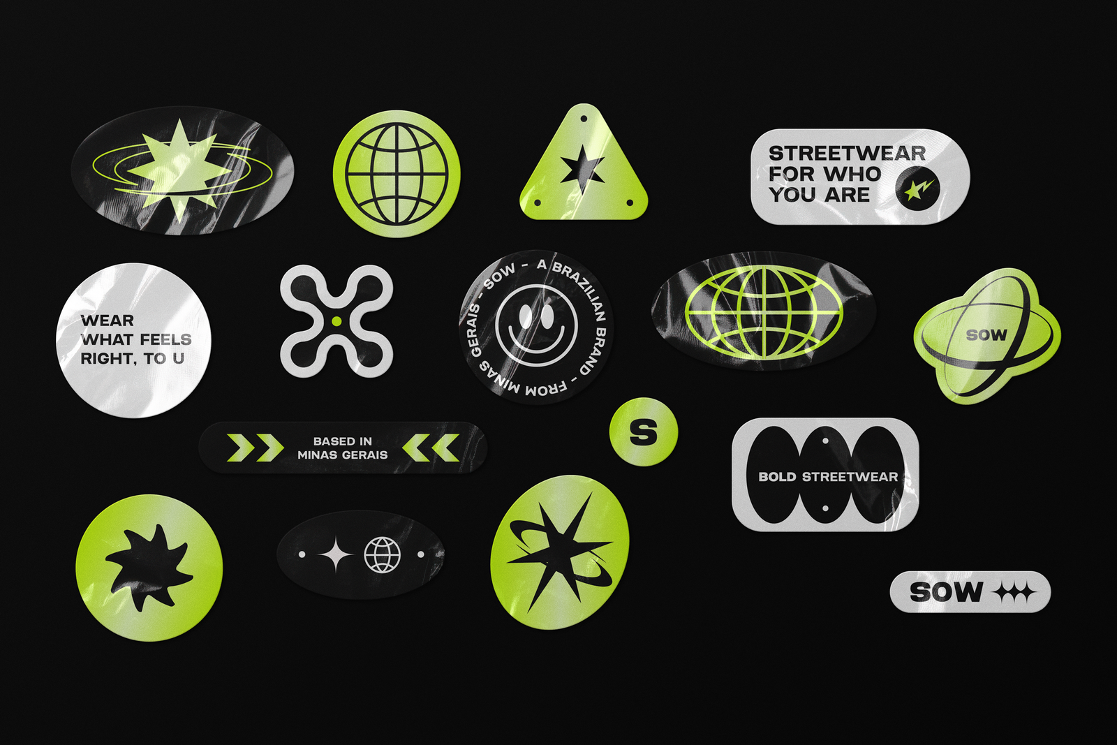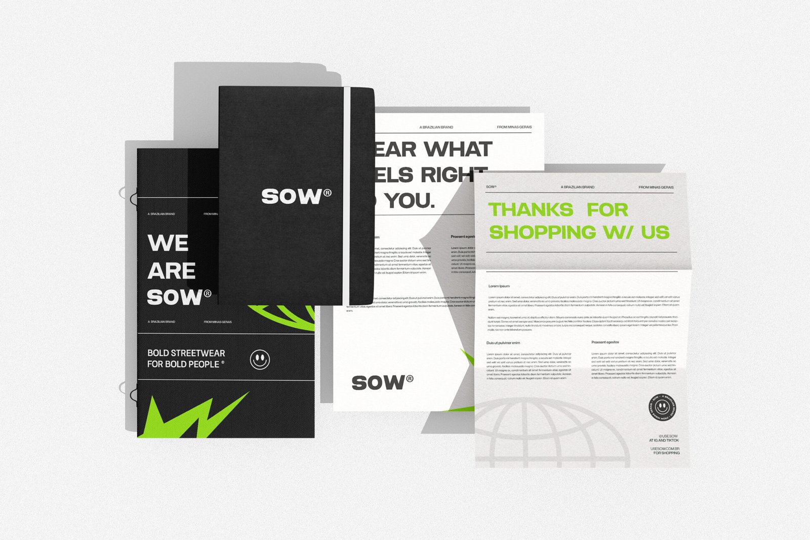 Present in urban environments and widely used by many streetwear brands, black Neutral Black C and white White Alyssun were chosen as the main colors of the palette, becoming the brand’s primary colors. As neutral tones, they are easy to apply and ensure the versatility and timelessness embedded in Sow’s DNA. And to bring more contrast and dynamism to the main composition, a vibrant green PMS 375 C was chosen as the secondary color. Similar to the shade used on Charli XCX’s brat Viral on social media, the term “brat” was chosen as the word of the year for 2024 by the Collins Dictionary and gained a new meaning, being used as an adjective to describe self-confidence and independence — characteristics of Sow’s buyer persona. album cover, it represents youth and renewal, characteristics that reflect the spirit of the brand’s audience.