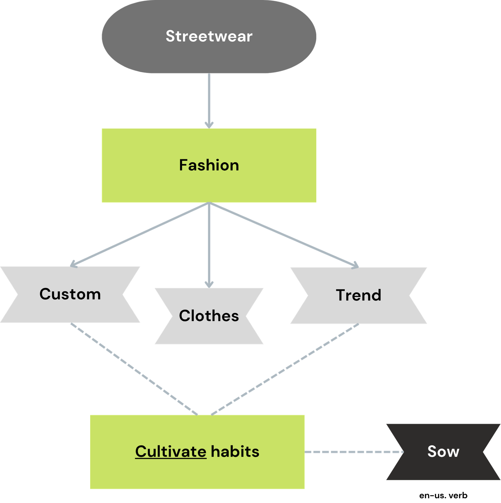 To arrive at the brand name, we used a methodology of word associations, starting with the term “Streetwear” which gave rise to a series of new concepts. We grouped the key words “custom” and “trend”, two fundamental pillars of fashion, which together refer to the idea of ​​”cultivating habits”. And from this combination, we arrived at a synonym for “cultivate”, the word “Sow”.